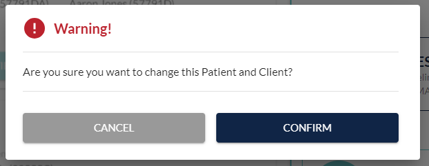 - Once you confirm that this is the action you wish to take, you will see the search fields to locate the current patient/client
