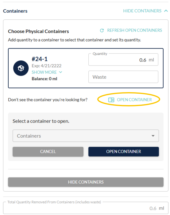 Click "Open a Container" to log the additional amount drawn from the secondary container.