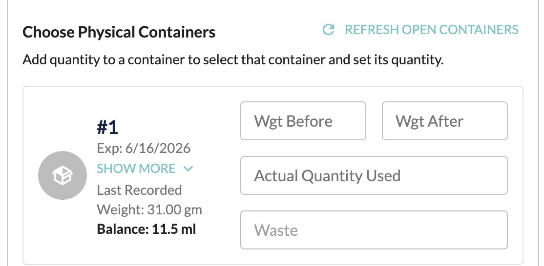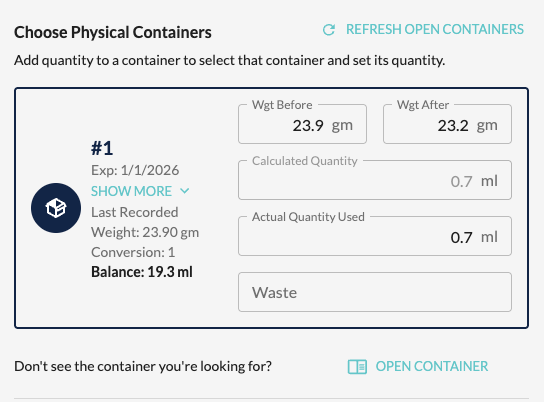 Select the appropriate container and log container weight before(optional) container weight after (optional) and actual quantity used in your chosen unit size.