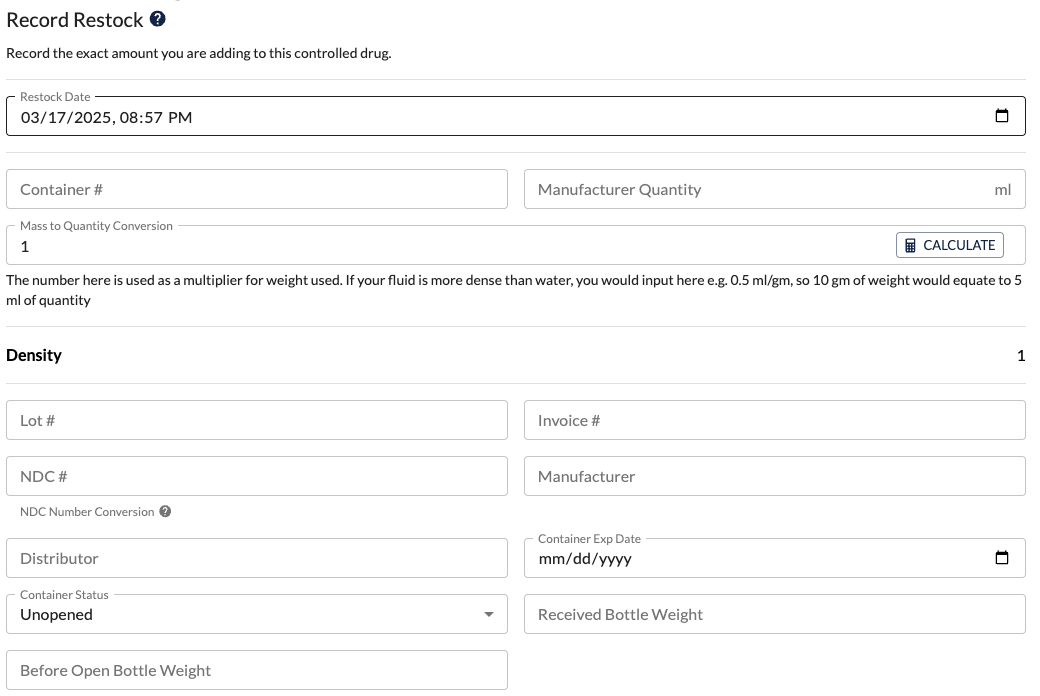 Restock your container and include optional received bottle weight, before open bottle weight, and open bottle weight in addition to the quantity to mass conversion.