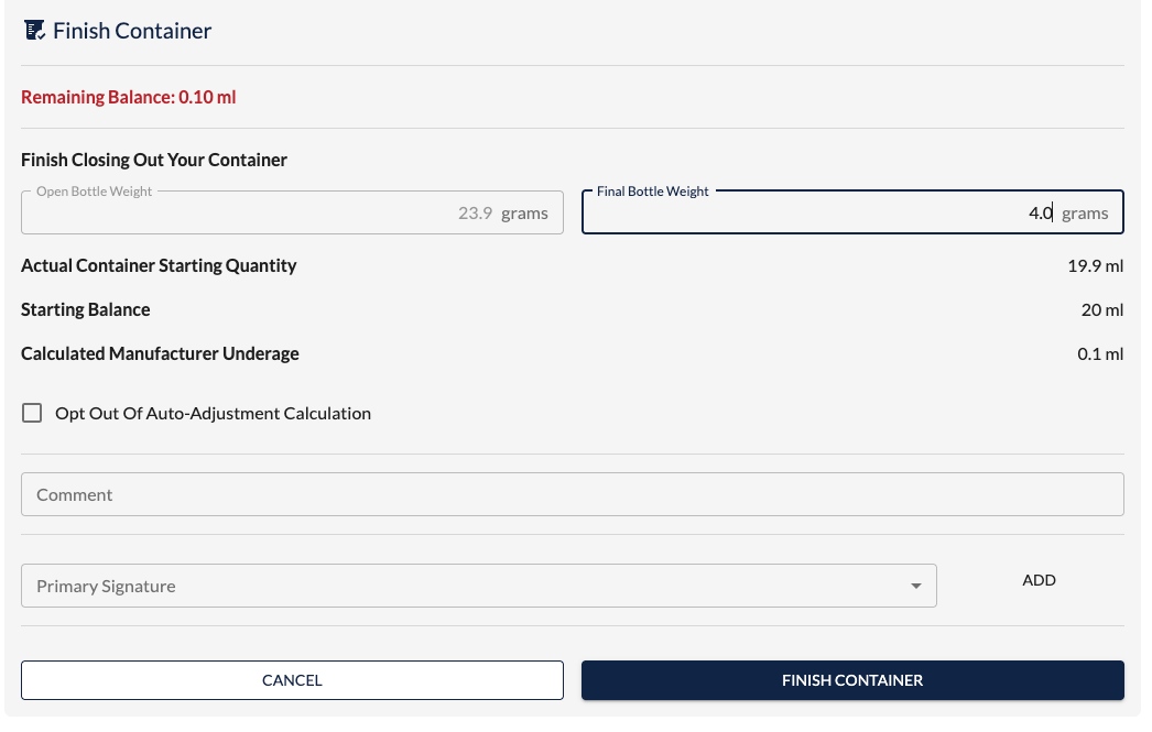 Enter your final bottle weight (optional) and we will calculate the actual container starting balance based on your quantity to mass conversion and make an auto adjustment for manufacturer overfill or underfill. The option to 'Opt Out' of this auto adjustment at any time.