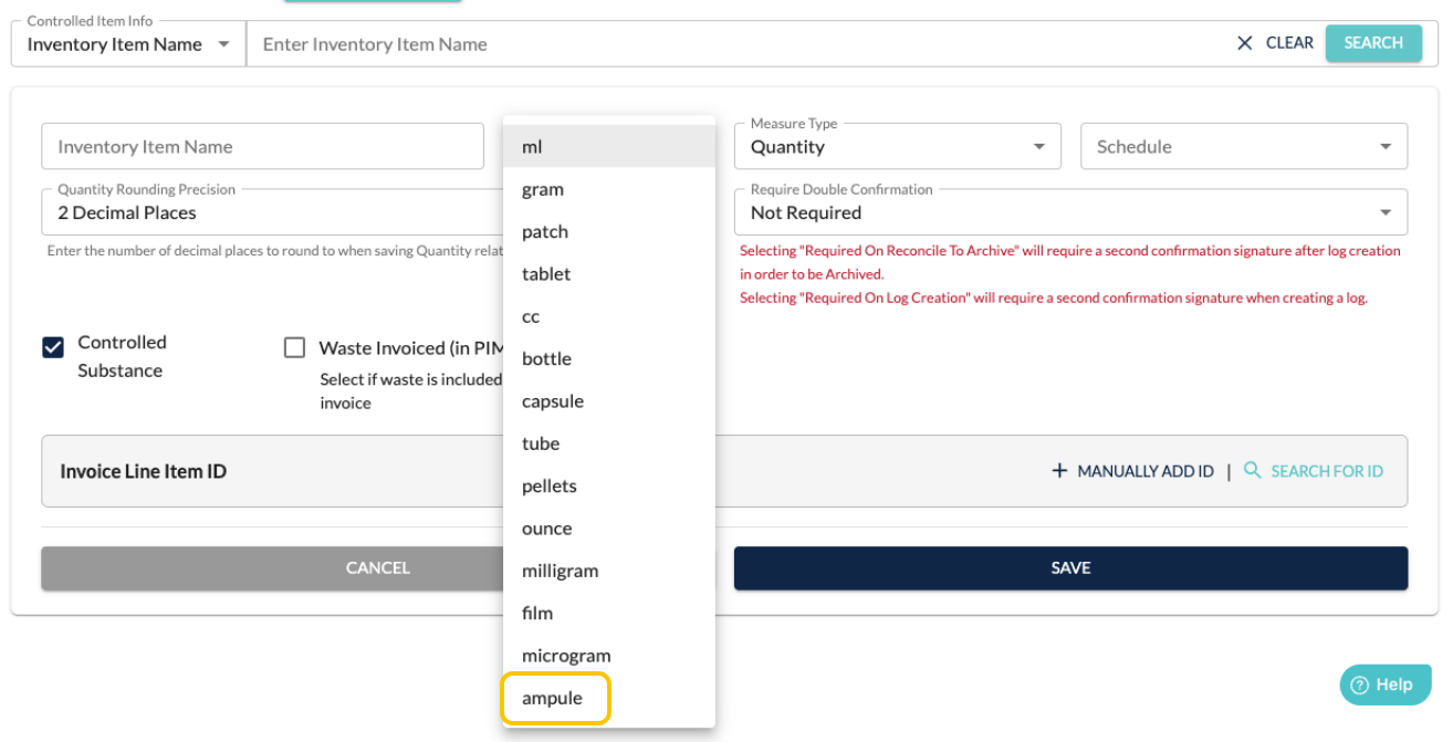 There is now an option to choose Ampule as the unit size in Create Inventory under Settings.