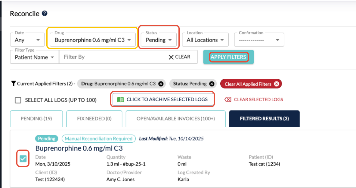 - Choosing Pending or Fix Needed log entries will allow you to Archive up to 100 log entries at once
