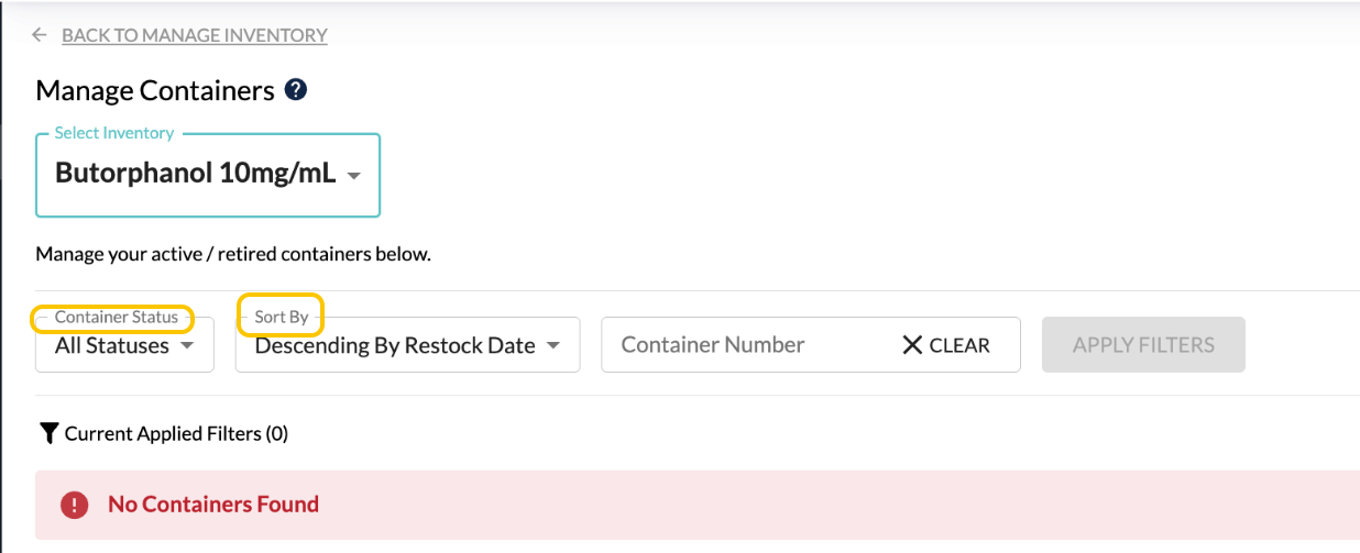 Currently, the manage containers page is set to display all containers, regardless of their status, and in descending order by the restock date.