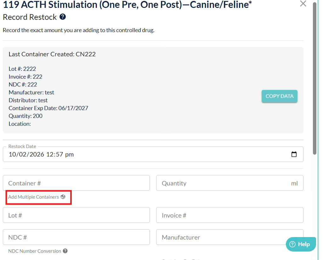 On the Restock screen, a new clickable text/button has been added underneath the Container Number field.