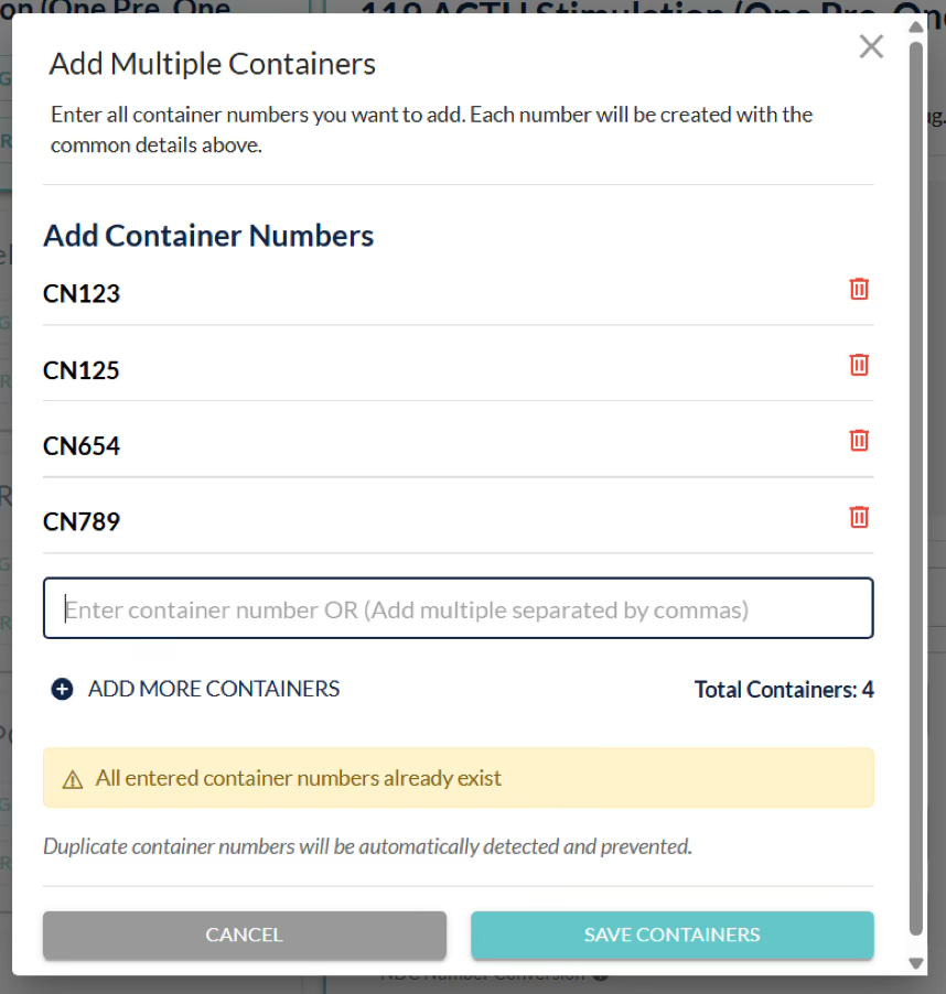 Duplicate container numbers will be skipped, and you will not be able to save without entering at least one container number.