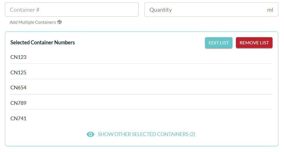 Please note: If you are weight tracking, the Received Bottle Weight and Before Open Bottle Weight is only asked for once. Therefore, the same weights entered in these fields will be copied on all containers on the list.